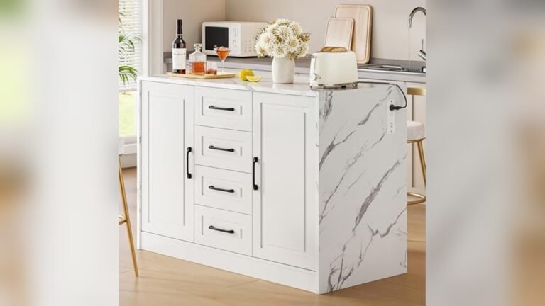 If you want a compact centerpiece with ample storage and power access, the ONBRILL 47.3″ Kitchen Island is your choice. It fits smaller spaces and keeps your kitchen organized with drawers and cabinets.