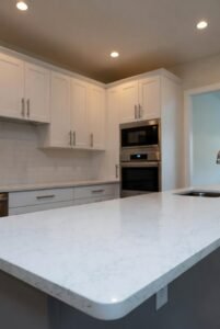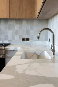 - Quartz or marble slabs for a smooth surface.