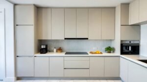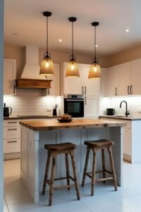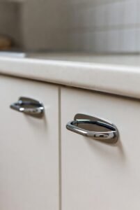 - Think about cabinet handles: simple metal or hidden handles look good.